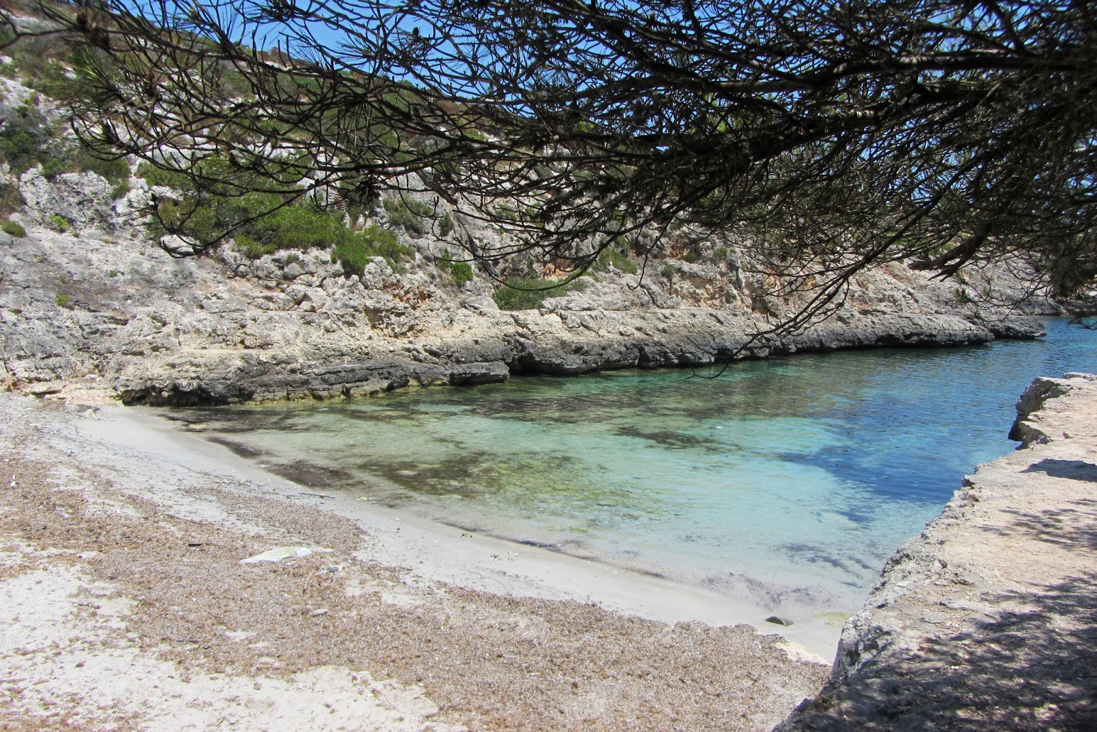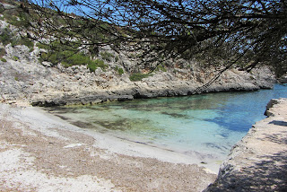 Zátoka číslo 3 – Cala Pilota je zdálky pěkná, leč zblízka plná jakéhosi hnědého nepořádku a odpadků. Jdeme tedy rovnou do zátoky číslo 4 – Cala Magraner – náš dnešní poslední cíl. Ta je hezky čistá. Skáčeme tedy do vody a syčíme, jak jsme z cesty rozpálení od sluníčka. Vypadá to, že na takovýchto skoro opuštěných plážích má každý správný chlap s sebou ženštinu bez horního dílu plavek. Přece Petra nezahanbím? Sundávám si tedy i svůj svršek (bezpečně ve stínu samozřejmě) a kupodivu mi to nevadí. Stud překonán. Asi že je to tu normou. V Čechách bych si netroufla.