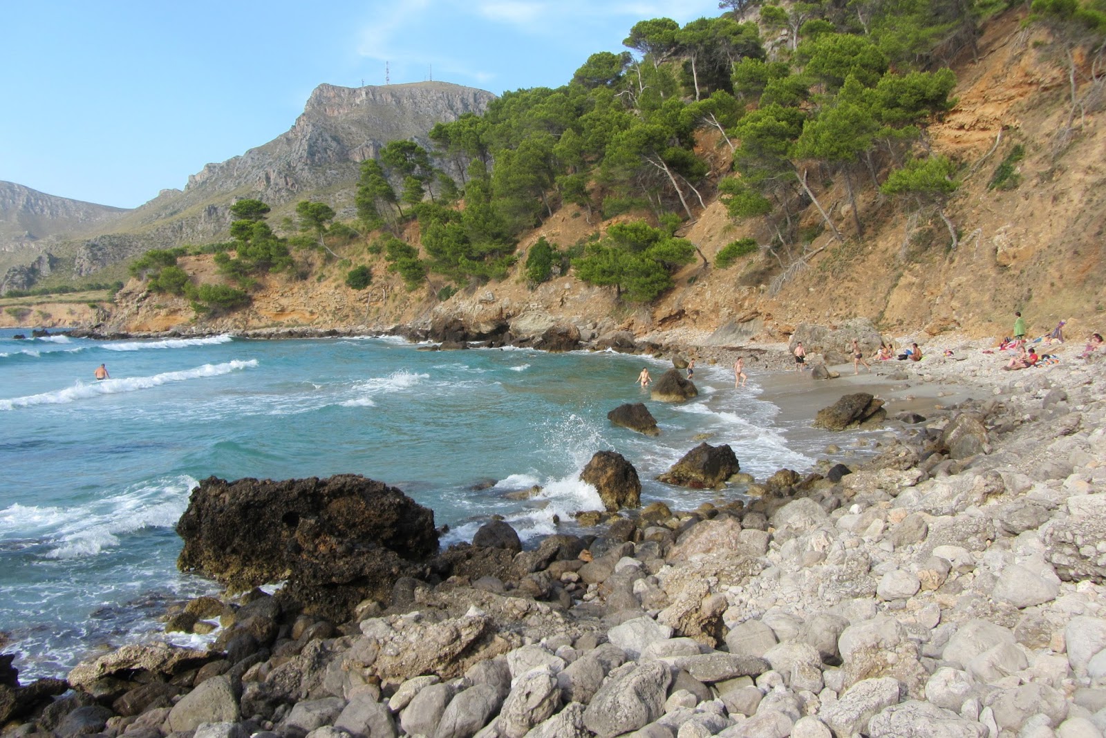 A tak si vybíráme pláže, které by měly být opuštěné, kdesi na severo-východě. Dnes jsme opět bez hotelu, třeba by se tam někde rovnou dalo přespat. Jedeme přes pohoří po prašné cestě, až najdeme pár zaparkovaných aut. Tady někde to tedy bude. K našemu zjištění vlny z předchozího dne nezmizeli, jsou ještě mohutnější. Je to síla, jak se rozbíjí o útesy. Vypadá to, že pláž je daleko, vydáváme se tedy pěšinou po útesech a zíráme na ty vlny. Nene, žádní plážoví povaleči nejsme. Je to jen otázka pohled. My nehledáme pláž, ale dáváme si track po pobřeží! Kráčíme si to pěkně po kamenité stezce na přímém sluníčku, jen chvilku jdeme pod borovicemi. Je to tu tedy cvrkot! Cvrčci z Čech by se měli na Mallorcu jezdit učit cvrkat! Jdeme kolem pláže Cala Matzoc. Musí tu být hezky nebýt těch vražedných vln. V průvodci psali, že je nevyspytatelná a za vln životu nebezpečná, jdeme tedy dál. Asi po hodině a půl chůze nacházíme krásnou panenskou pláž s bílým pískem – Playa Sa Font Celada. Jsou tu jen další dva turisti. Škoda těch obřích vln, na plavání to fakt není, tak se alespoň smočíme na kraji. Turisté odchází a my se svlíkáme z plavek. Aspoň na chvíli jsme jako Adam a Eva (Eva řádně namazaná) na pustém ostrově…